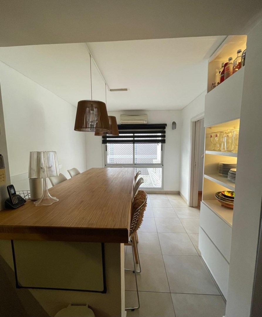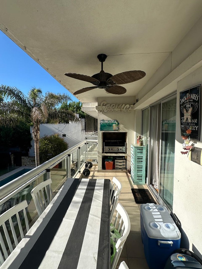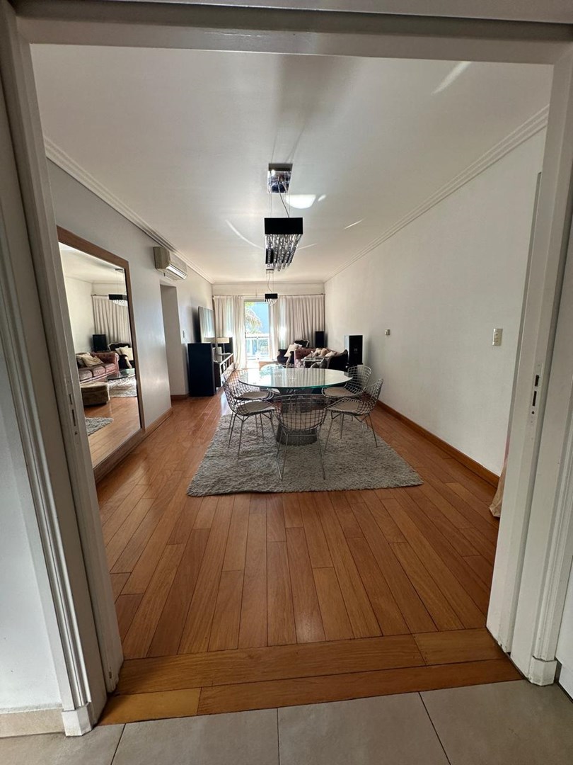 Living comedor con pisos entarugados y gran balcón con parrilla