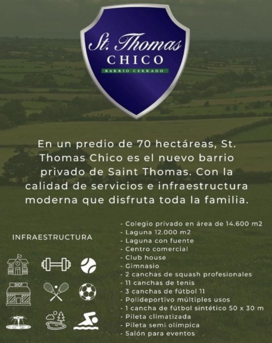 Venta Lote en excelente ubicación - Saint Thomas Chico | Countries/B.Cerrado Juana de Arco, Canning Saint Thomas Chico | Countries/B.Cerrado (E. Echeverría) | Esteban Echeverría USD 75.000 N de lote 542 Superficies y medidas Terreno: 700 m² Servicios Agua Corriente Electricidad Cloaca Gas Envasado Adicionales Cancha de Tenis Cancha de Fútbol Zonas Verdes Cancha de Paddle Pileta Gimnasio SUM Laguna interior SOBRE EL BARRIO: Saint Thomas Chico es un proyecto que abarca 70 hectáreas con 580 lotes desde 600 hasta 1400 m2. El desarrollo cuenta con canchas de tenis, cancha de fútbol, cancha de básquetbol, cancha de squash, cancha de hockey, cancha de pádel, 3 piscinas (una climatizada), gimnasio, restaurante, salón para eventos, áreas verdes, 2 lagunas (una de 12.000 m2 y otra de 2.500m2), centro comercial “Saint Thomas Shop” y área dedicada a un futuro colegio.